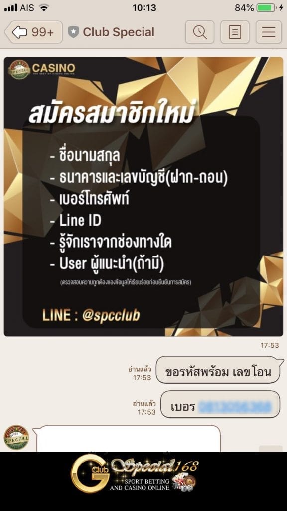 1. ให้นักพนันแอดไลน์ @spcclub แล้วแจ้งกับทางเจ้าหน้าที่ว่า สมัคร Gclub จากนั้นเจ้าหน้าที่ก็จะขอข้อมูลส่วนตัวของนักพนันไม่ว่าจะเป็น ชื่อนามสกุล เลขบัญชีธนาคาร ไอดีไลน์
